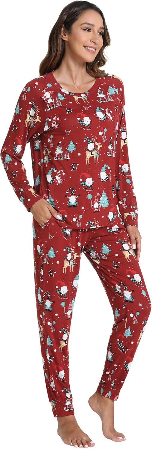 WiWi Viscose from Bamboo Women's Pajama Set Soft Long Sleeve Pajamas Sets S-XXL(A-christmas Elk on Red)