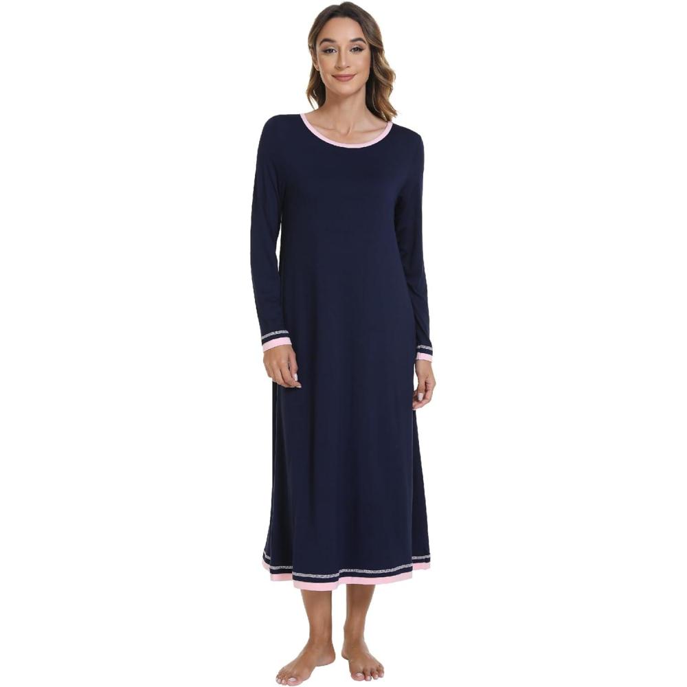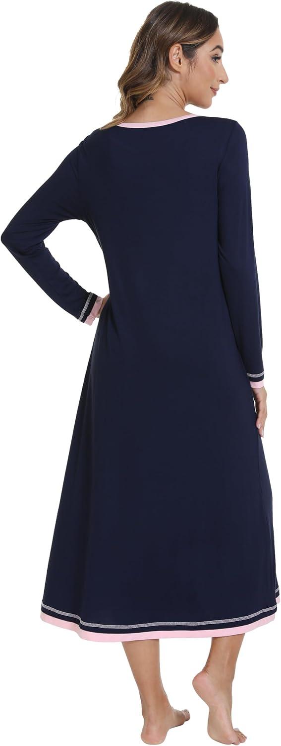 WiWi Women's Long Nightgowns Long Sleeve Lightweight Viscose from Bamboo Sleepwear S-XXL(C-navy)