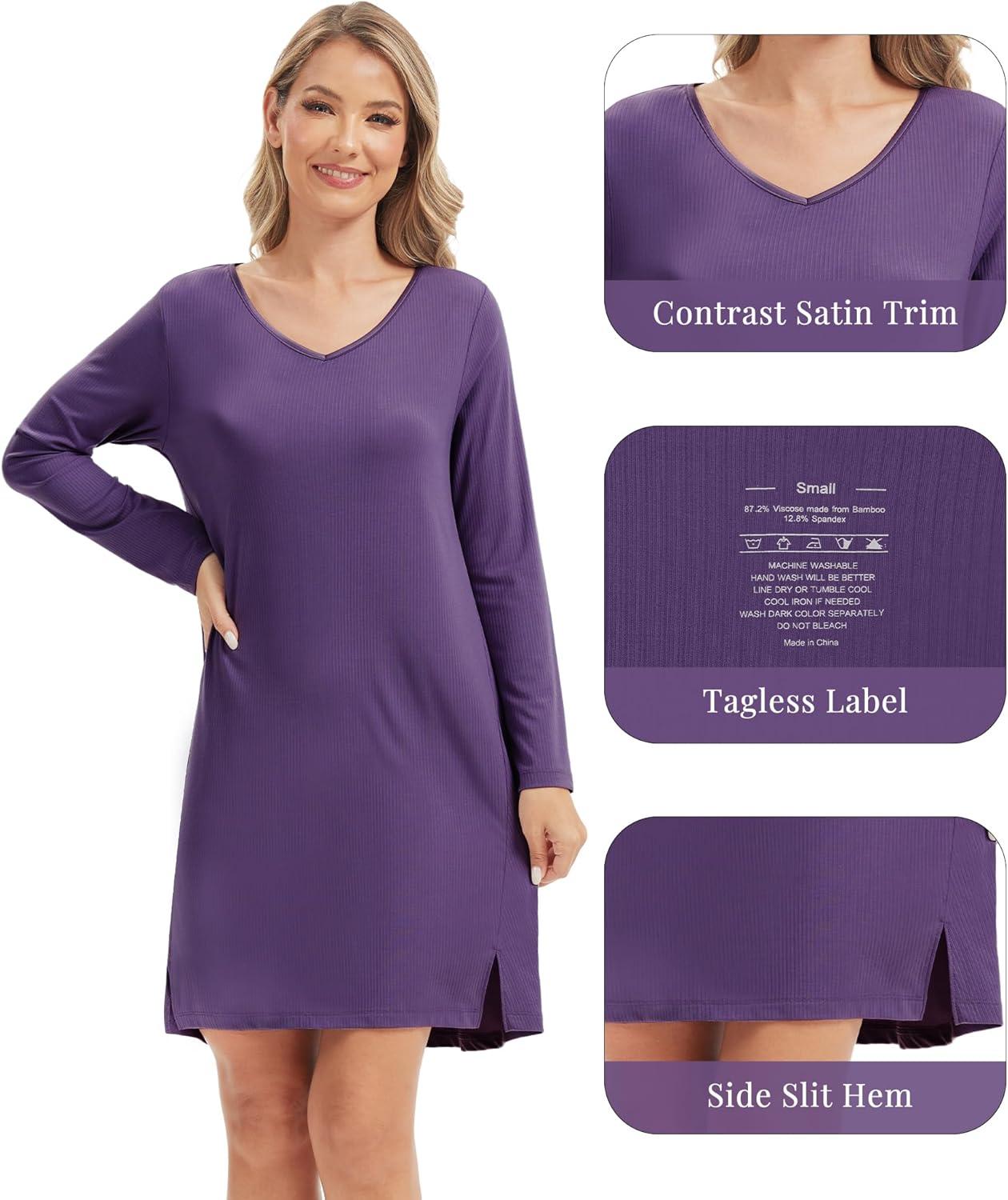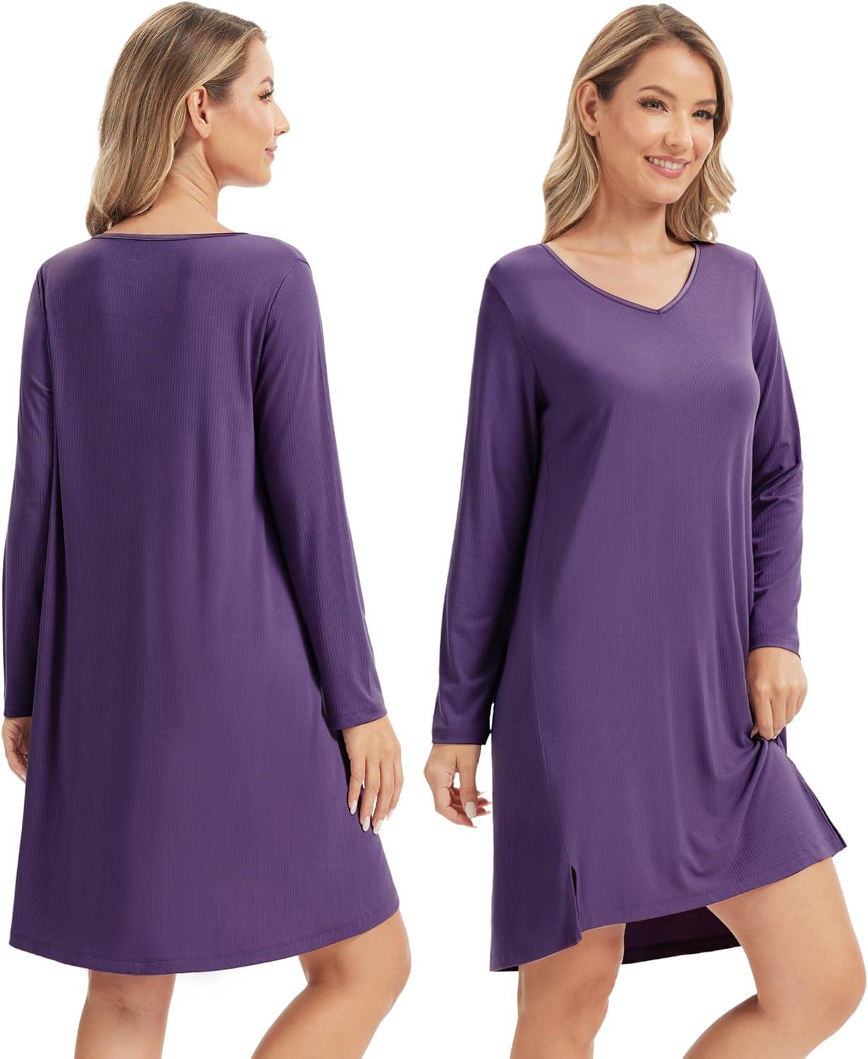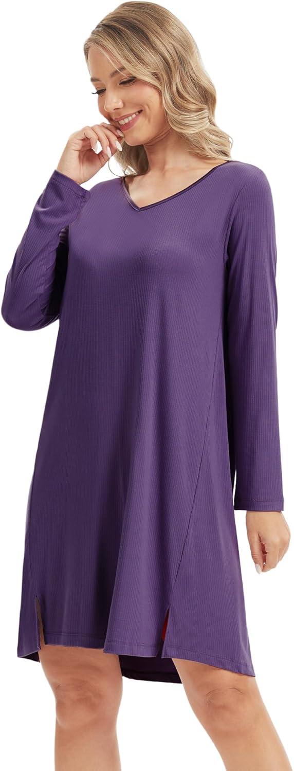 WiWi Women’s Nightgown Soft Ribbed Long Sleeve Nightshirt Bamboo Viscose V-Neck Sleepwear Casual Sleep Shirt S-XXL(Dark Purple)