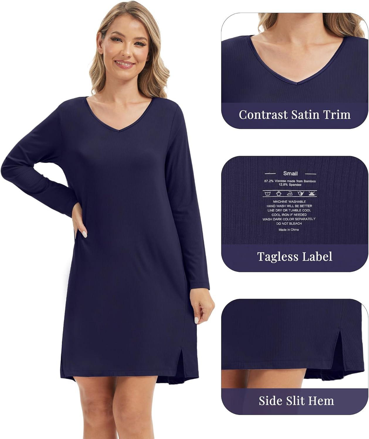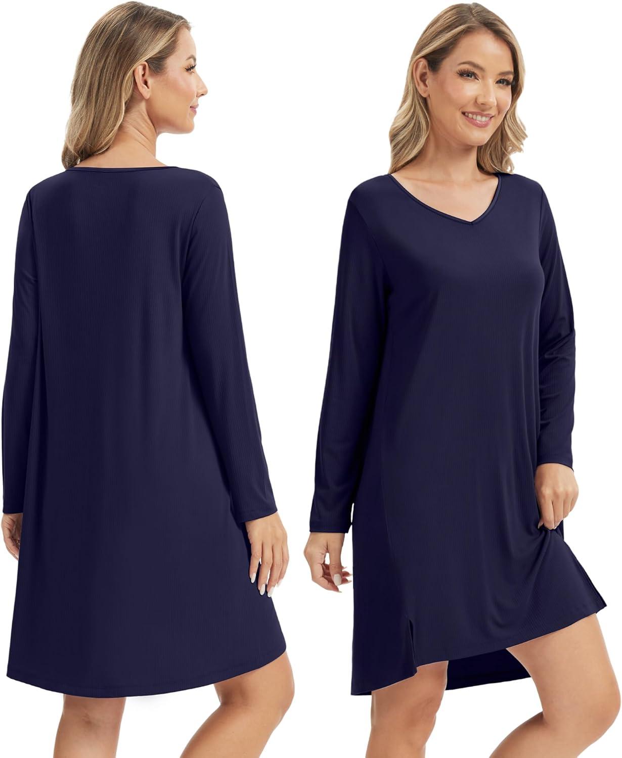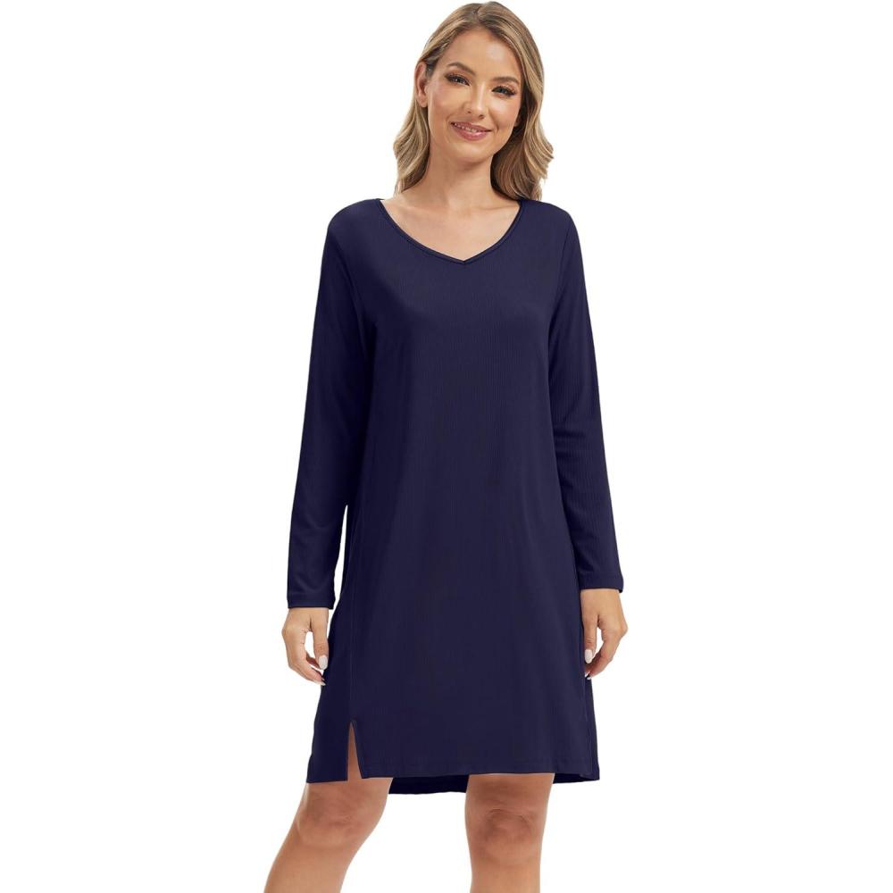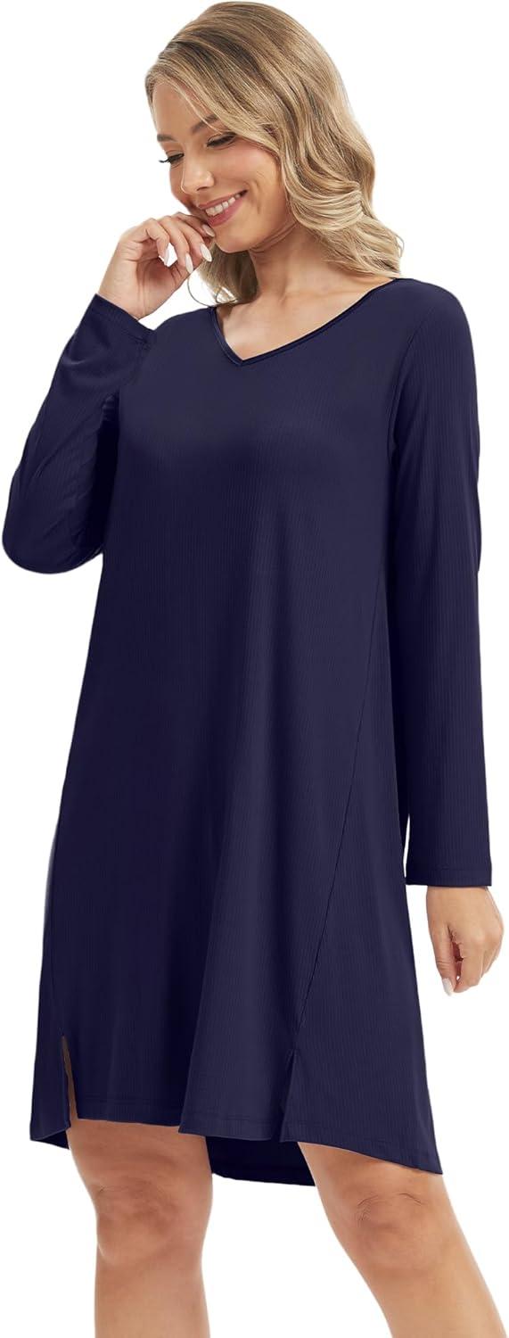 WiWi Women’s Nightgown Soft Ribbed Long Sleeve Nightshirt Bamboo Viscose V-Neck Sleepwear Casual Sleep Shirt S-XXL(Navy)