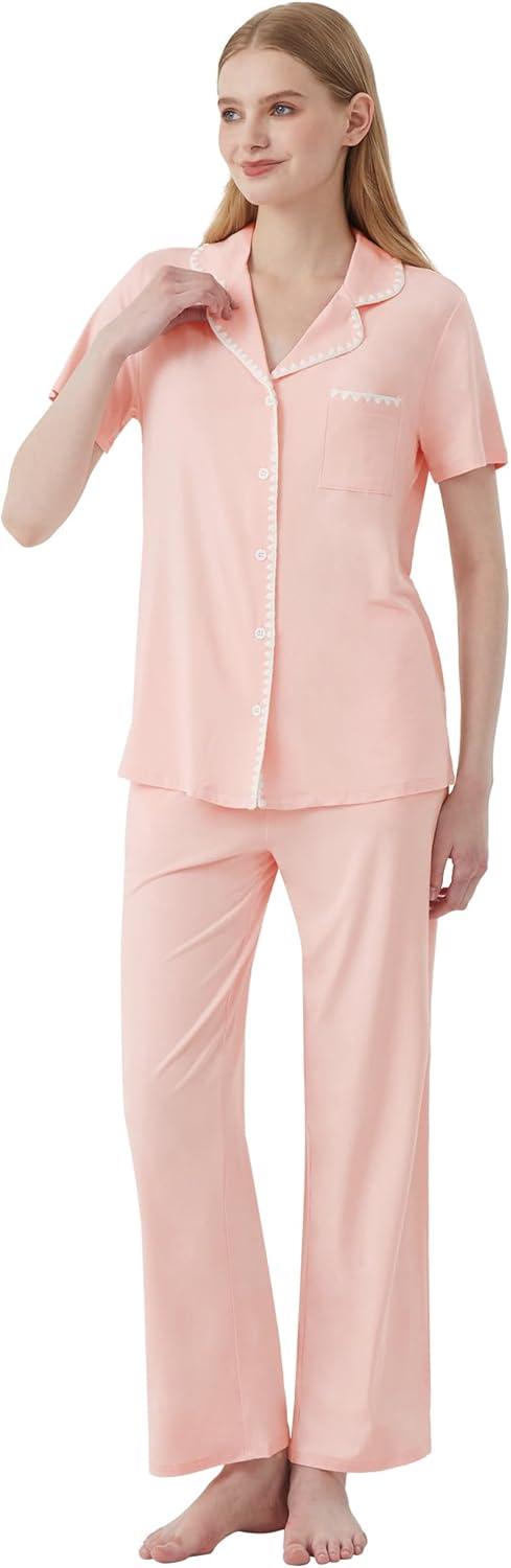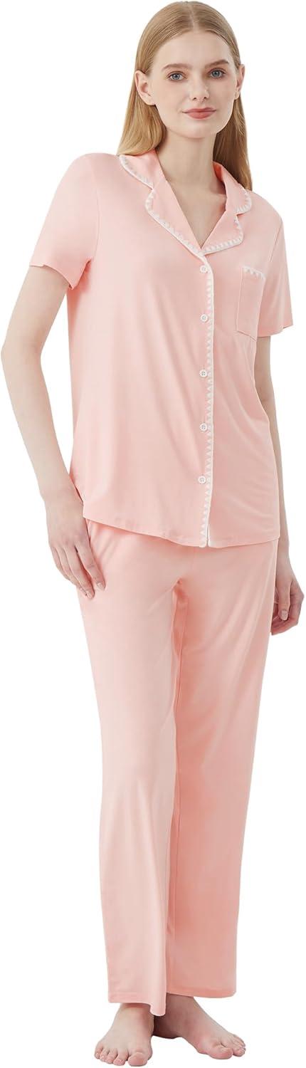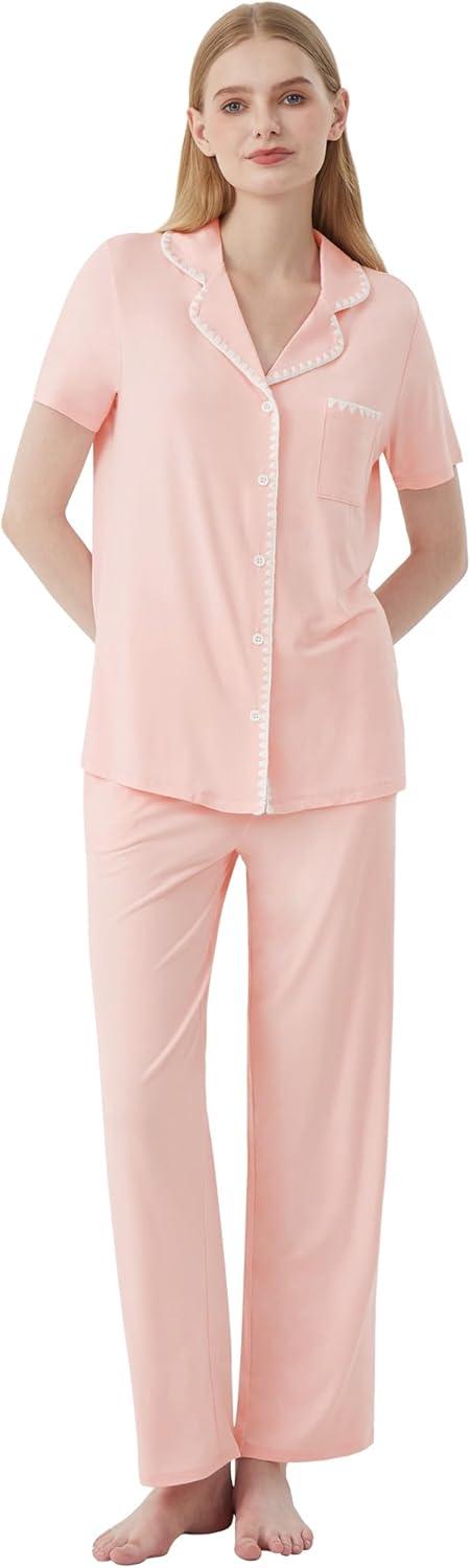 WiWi Women’s Pajama Set Button Down Sleepwear Soft Bamboo Viscose Loungewear with Pockets 2 Piece PJ Sleepwear S-XXL(A-cream Pink)