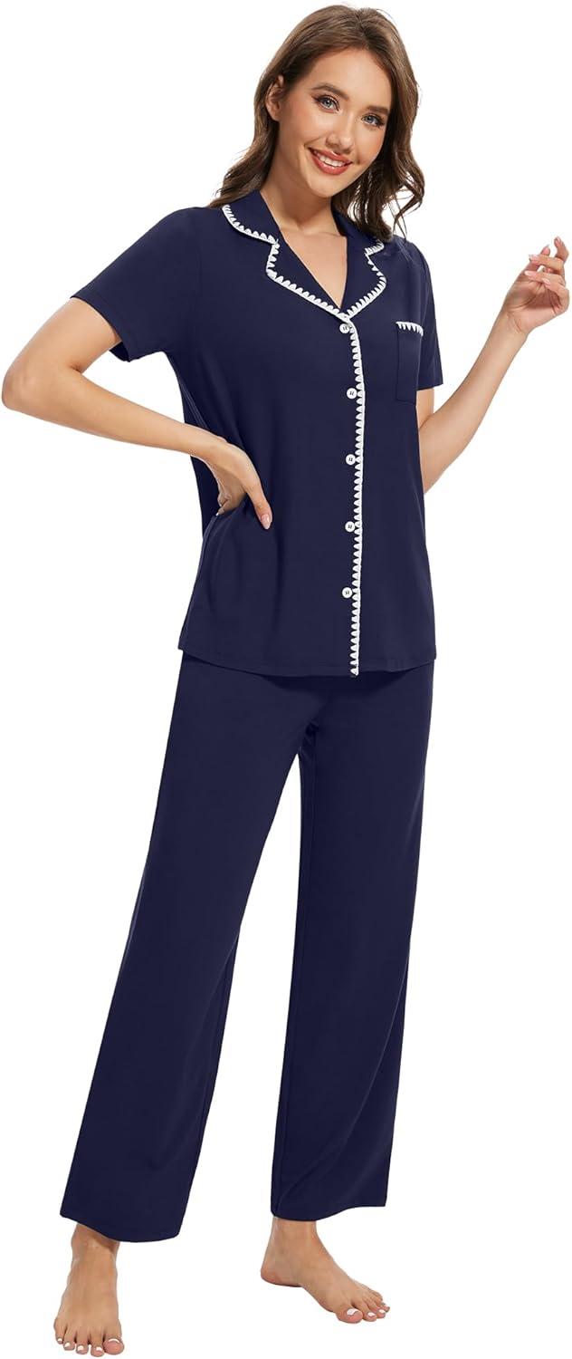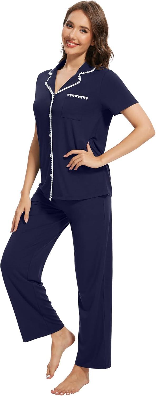 WiWi Women’s Pajama Set Button Down Sleepwear Soft Bamboo Viscose Loungewear with Pockets 2 Piece PJ Sleepwear S-XXL(A-navy)
