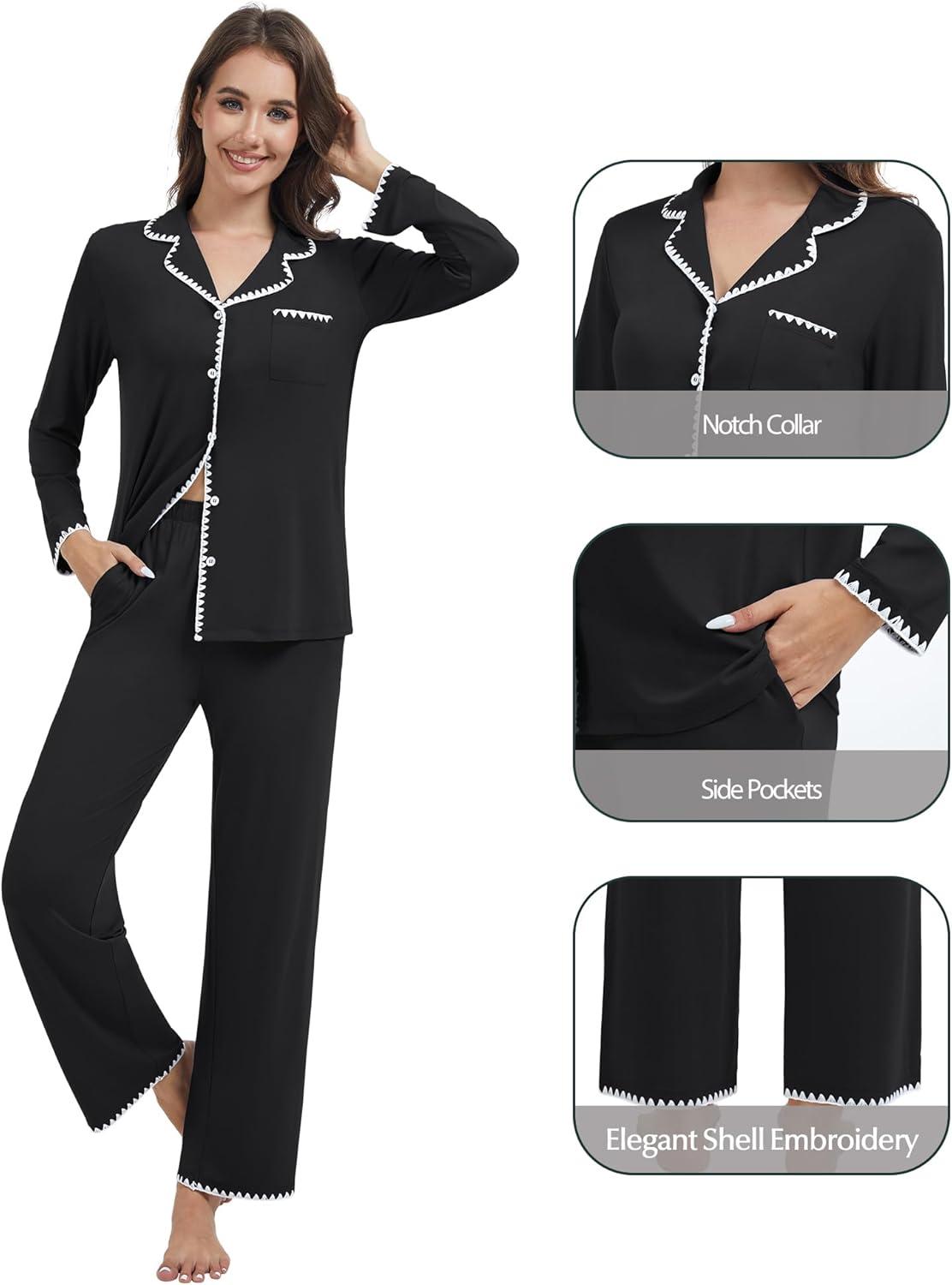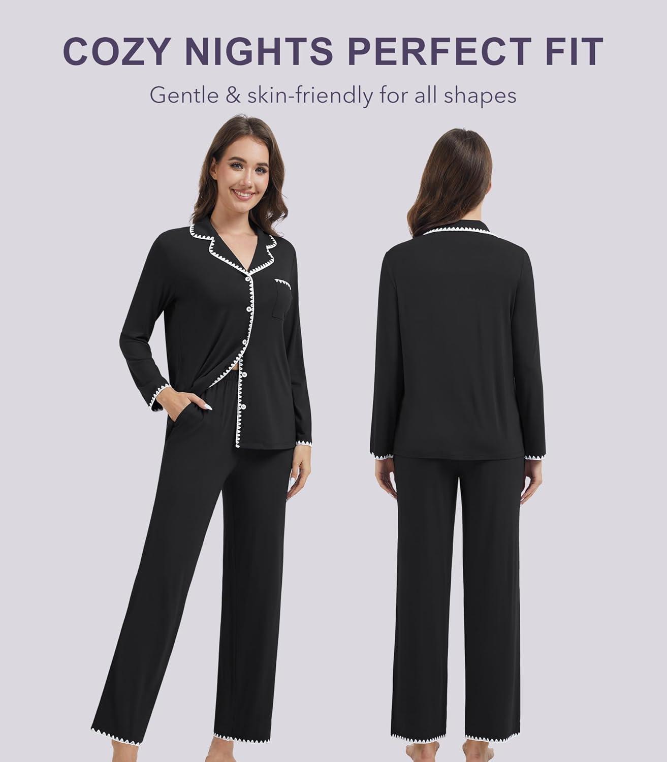 WiWi Women's Pajama Set Button Down Sleepwear Soft Bamboo Viscose Loungewear with Pockets 2 Piece PJ Sleepwear S-XXL(B-black)