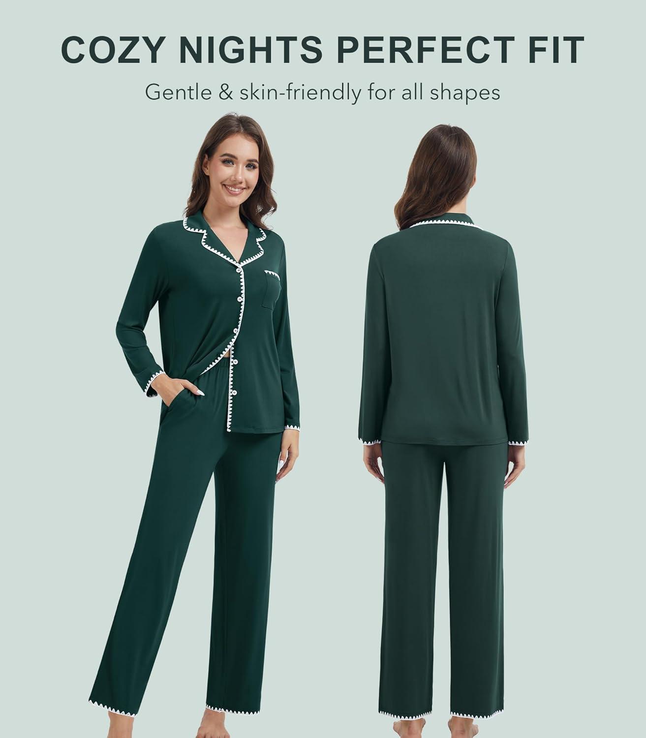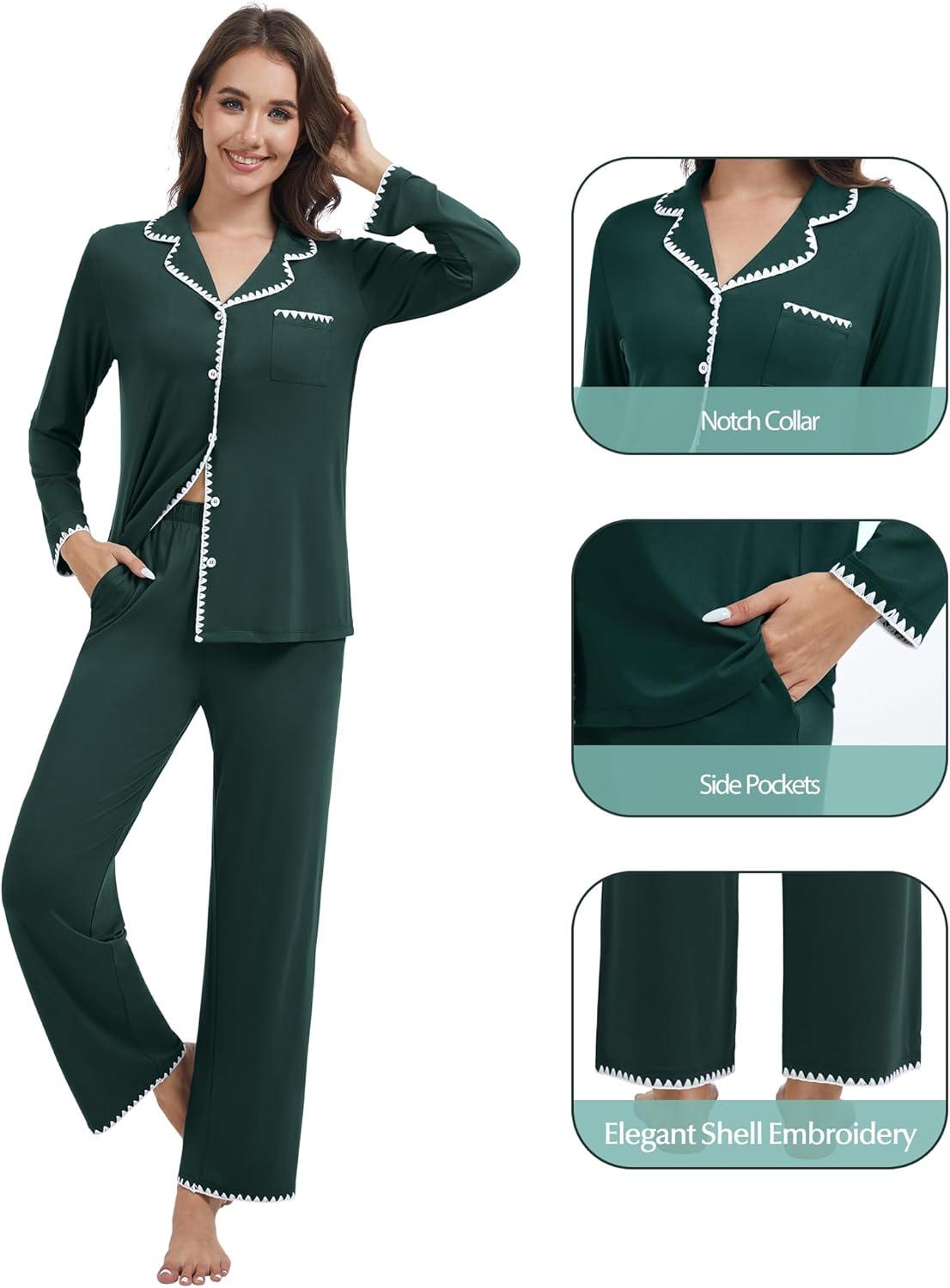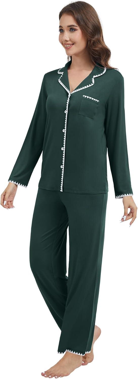 WiWi Women's Pajama Set Button Down Sleepwear Soft Bamboo Viscose Loungewear with Pockets 2 Piece PJ Sleepwear S-XXL(B-blackish Green)