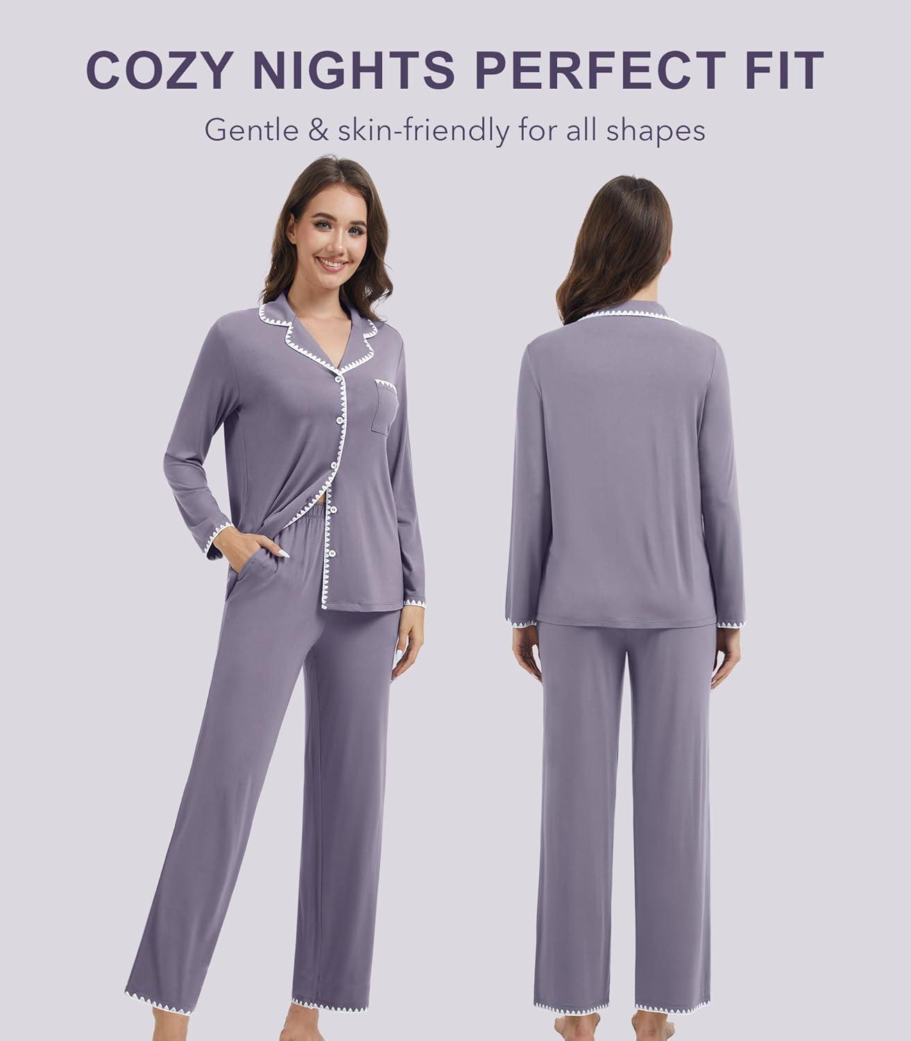 WiWi Women’s Pajama Set Button Down Sleepwear Soft Bamboo Viscose Loungewear with Pockets 2 Piece PJ Sleepwear S-XXL(B-purplish Grey)