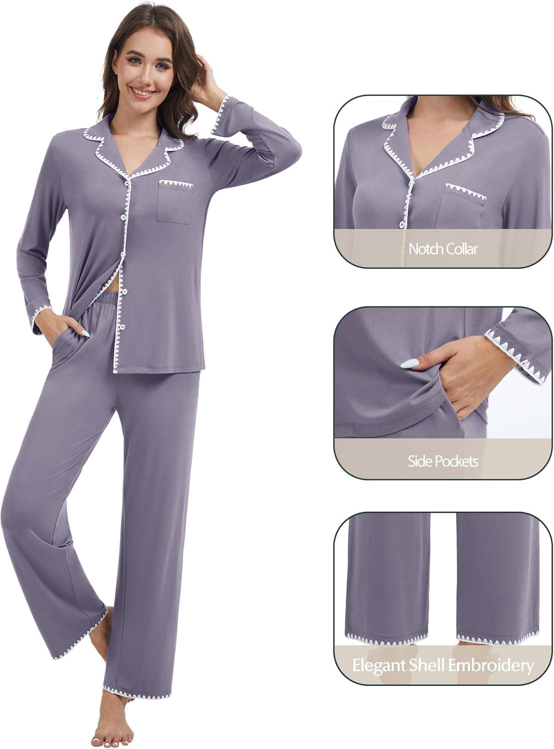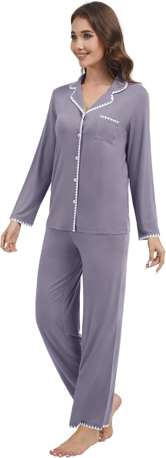 WiWi Women's Pajama Set Button Down Sleepwear Soft Bamboo Viscose Loungewear with Pockets 2 Piece PJ Sleepwear S-XXL(B-purplish Grey)