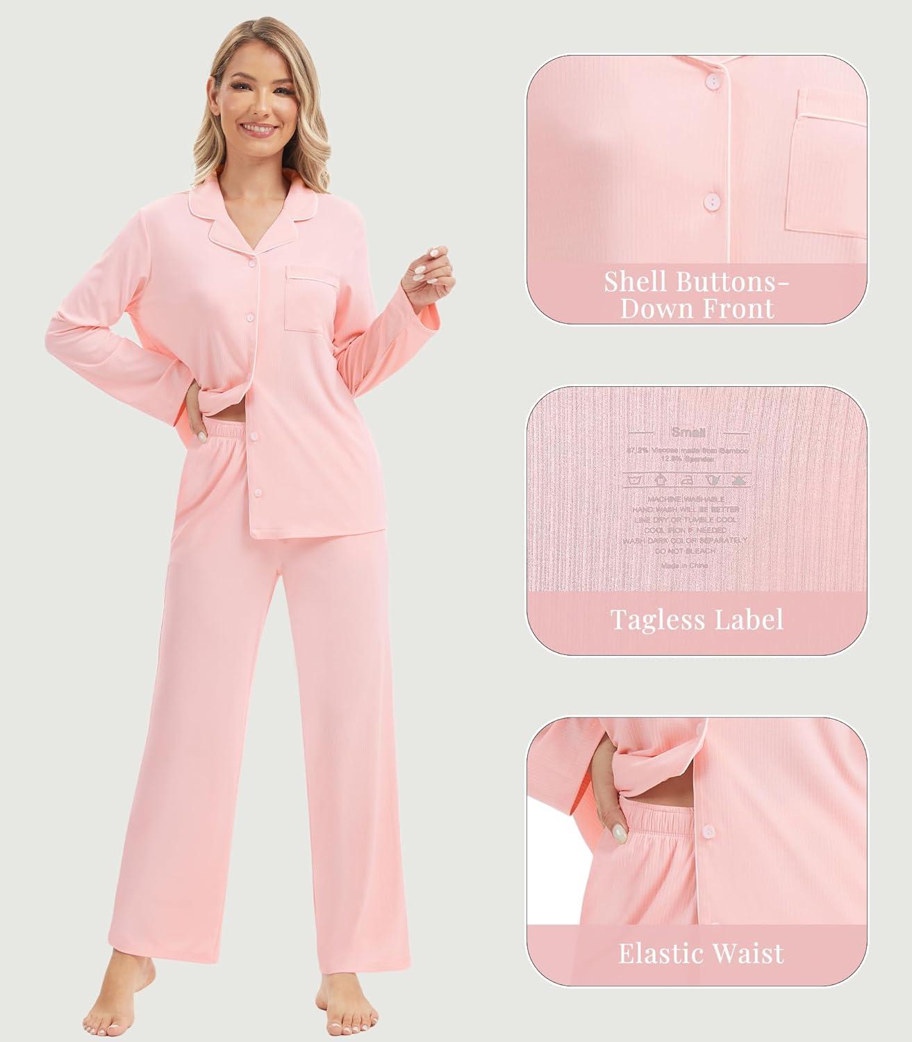 WiWi Women's Pajama Sets 2 Piece Button Down Lounge Set Soft Ribbed Long Sleeve Top and Pants Sleepwear S-XXL(Peach Pink)