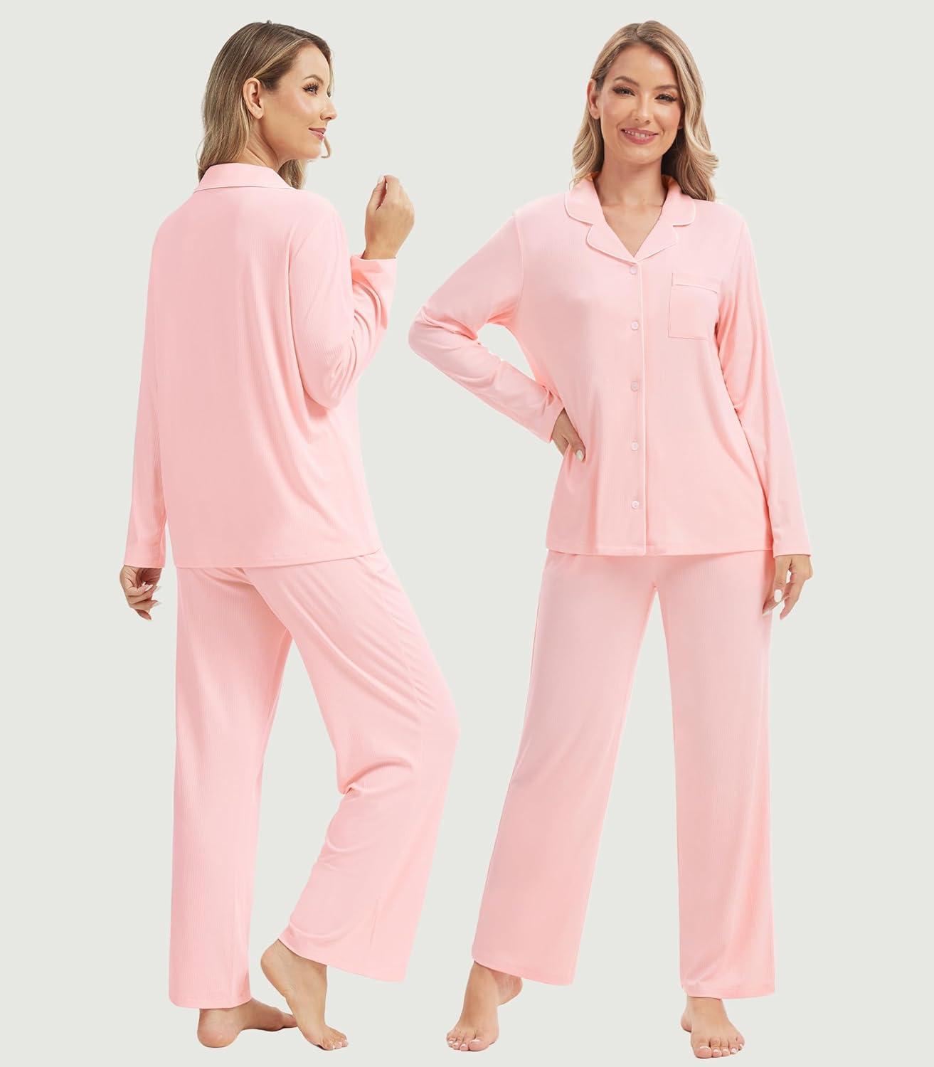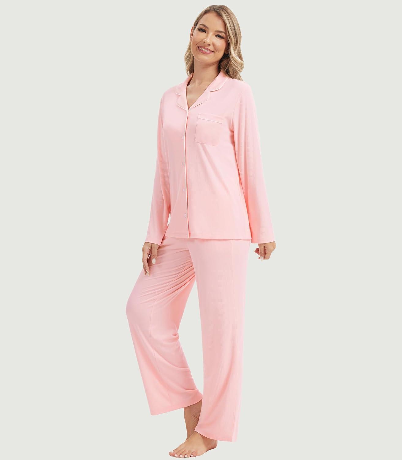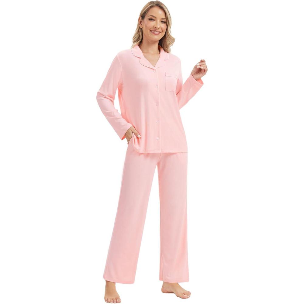 WiWi Women’s Pajama Sets 2 Piece Button Down Lounge Set Soft Ribbed Long Sleeve Top and Pants Sleepwear S-XXL(Peach Pink)
