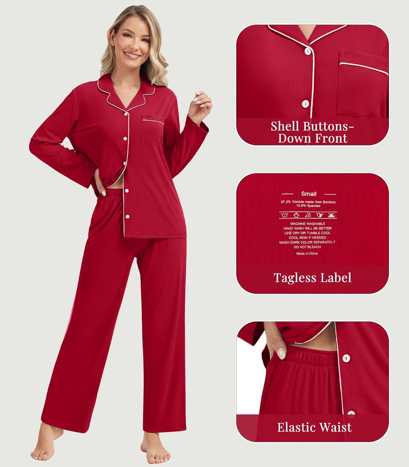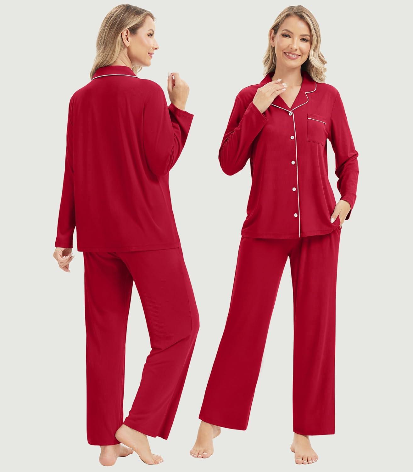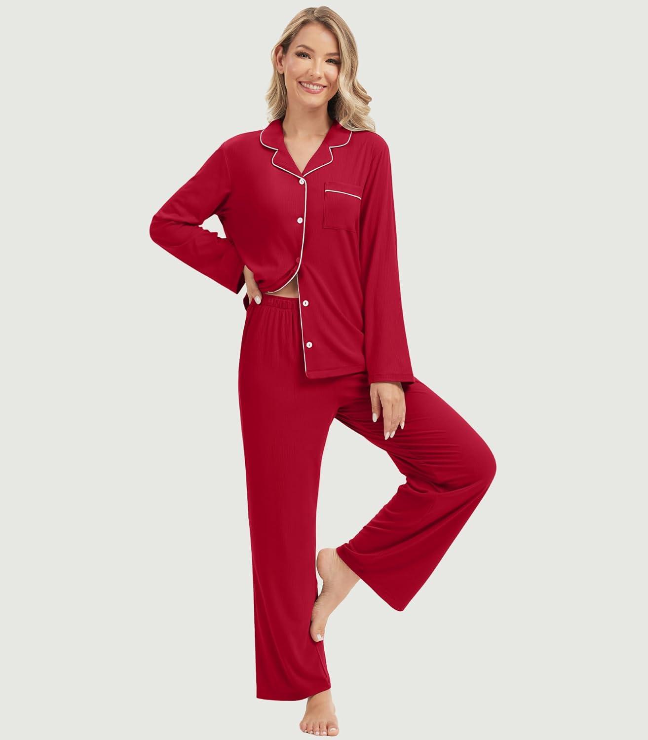 WiWi Women's Pajama Sets 2 Piece Button Down Lounge Set Soft Ribbed Long Sleeve Top and Pants Sleepwear S-XXL(Wind Red)