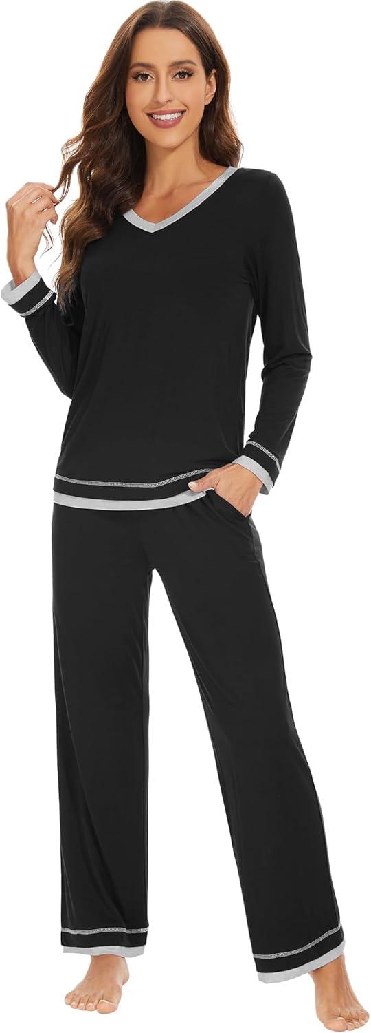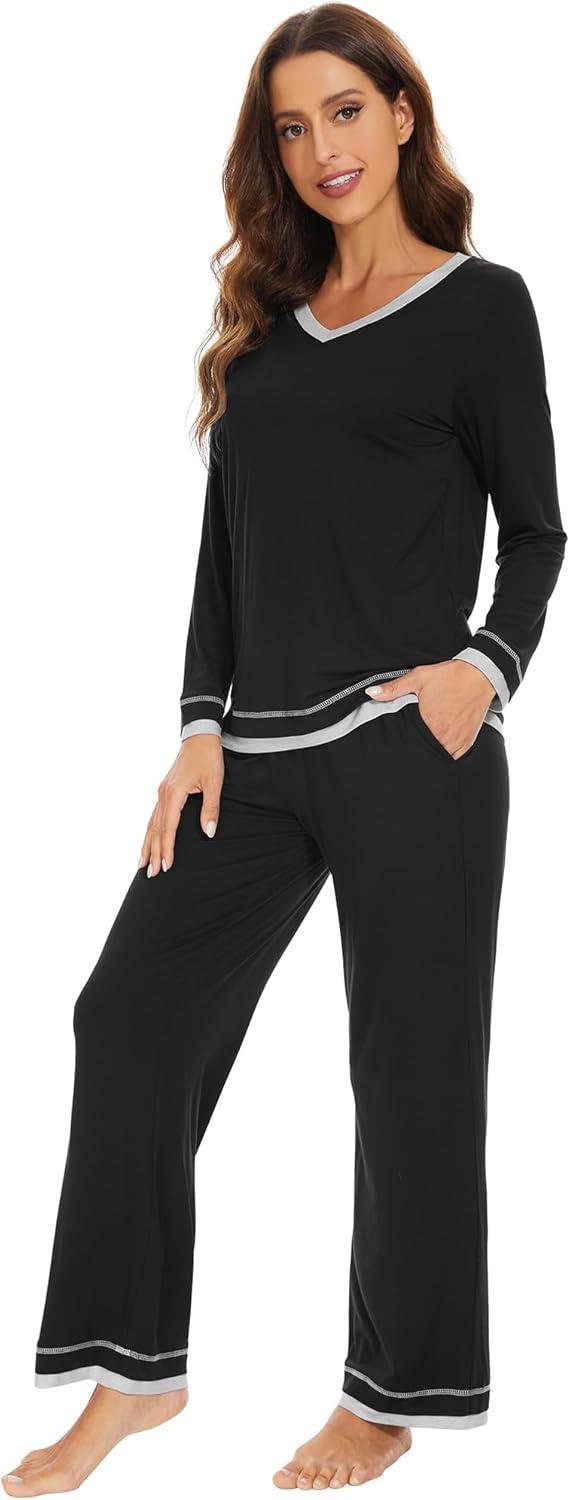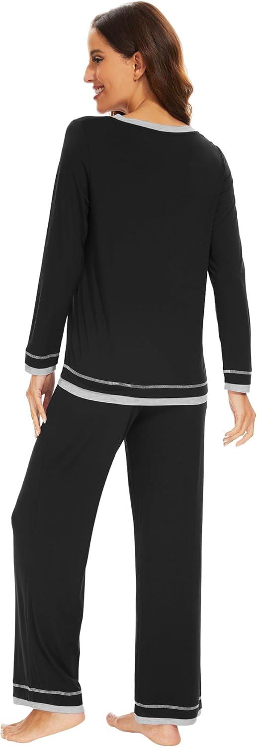 WiWi Women's Pajama Sets Soft Long Sleeves Top with Pants PJ 2 Piece Viscose from Bamboo Loungewear Set S-XXL(C-black)