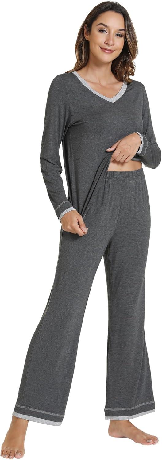 WiWi Women’s Pajama Sets Soft Long Sleeves Top with Pants PJ 2 Piece Viscose from Bamboo Loungewear Set S-XXL(C-dark Heather Grey)