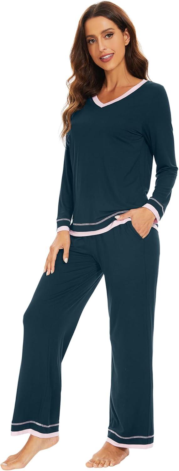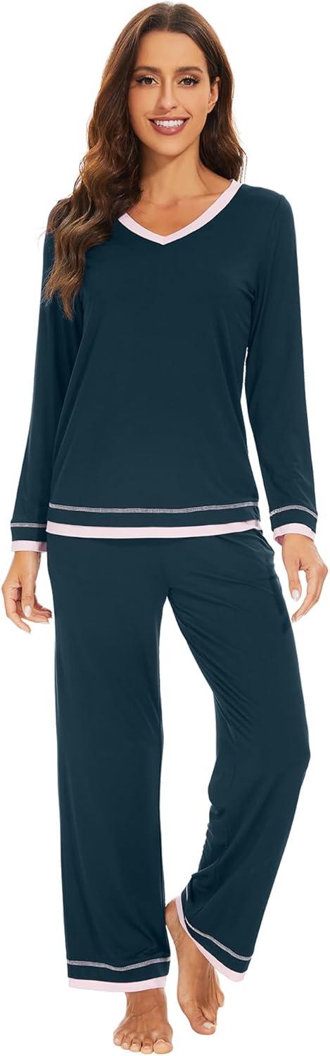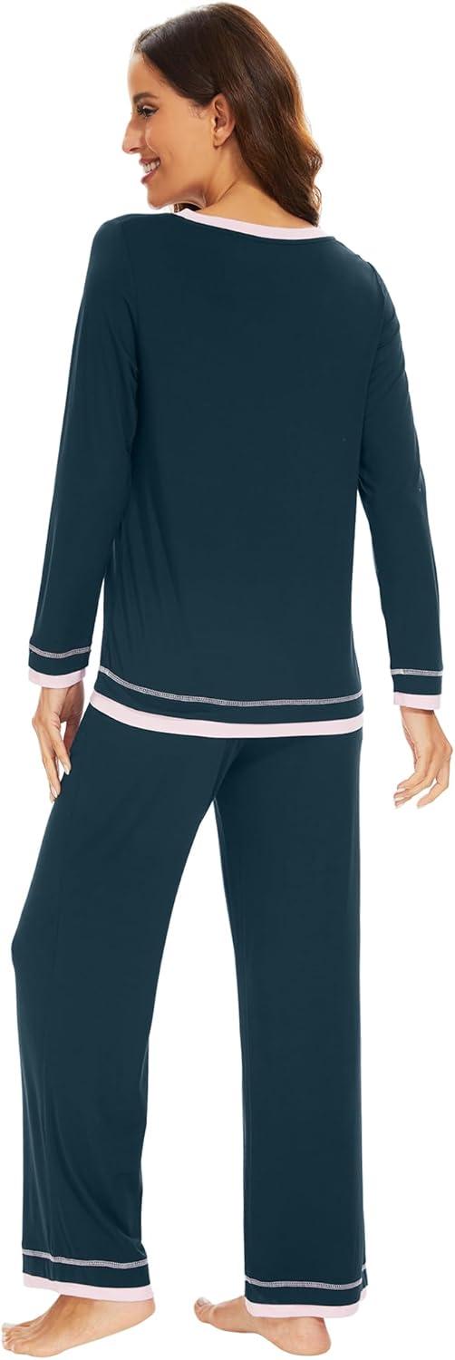 WiWi Women’s Pajama Sets Soft Long Sleeves Top with Pants PJ 2 Piece Viscose from Bamboo Loungewear Set S-XXL(C-deep Teal)