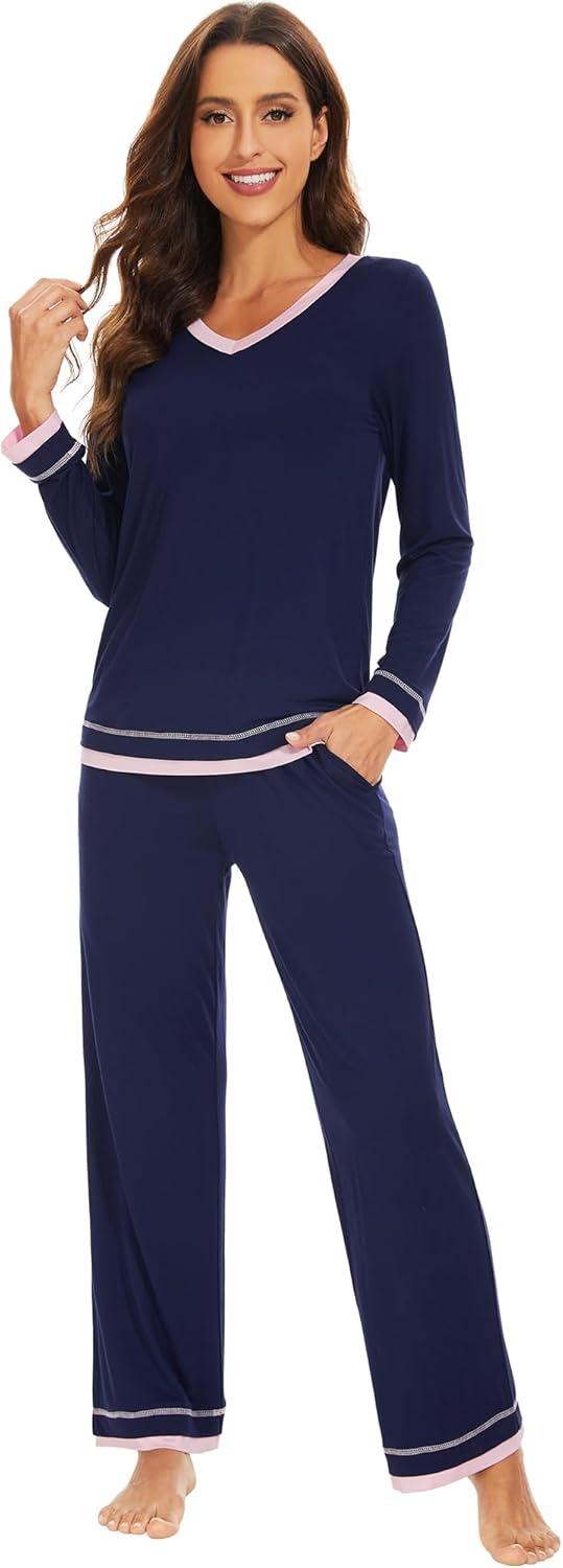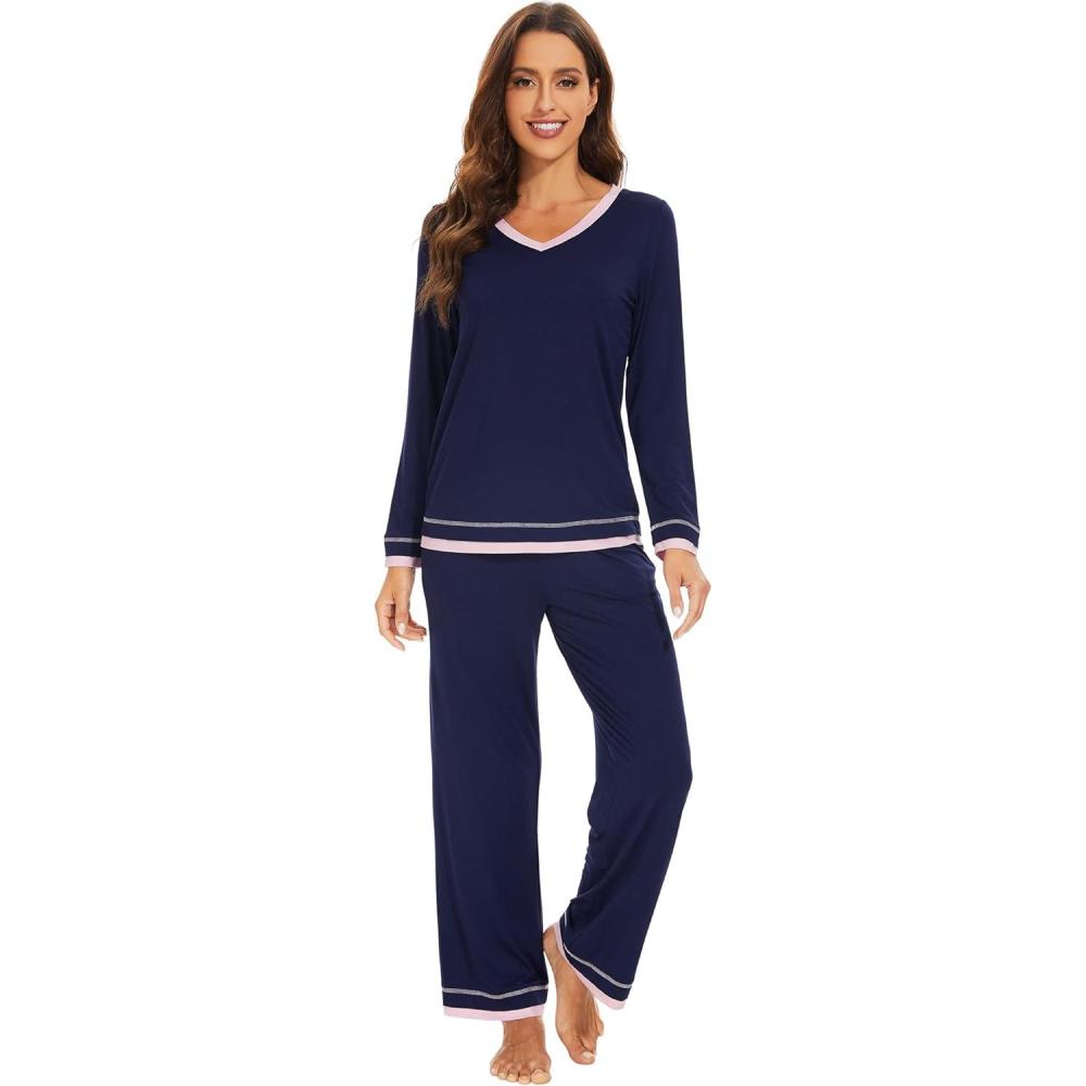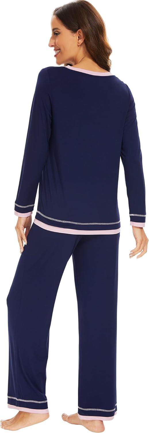 WiWi Women's Pajama Sets Soft Long Sleeves Top with Pants PJ 2 Piece Viscose from Bamboo Loungewear Set S-XXL(C-navy)