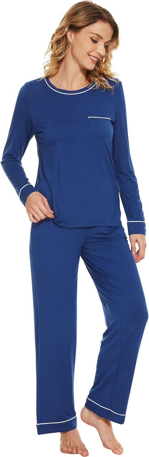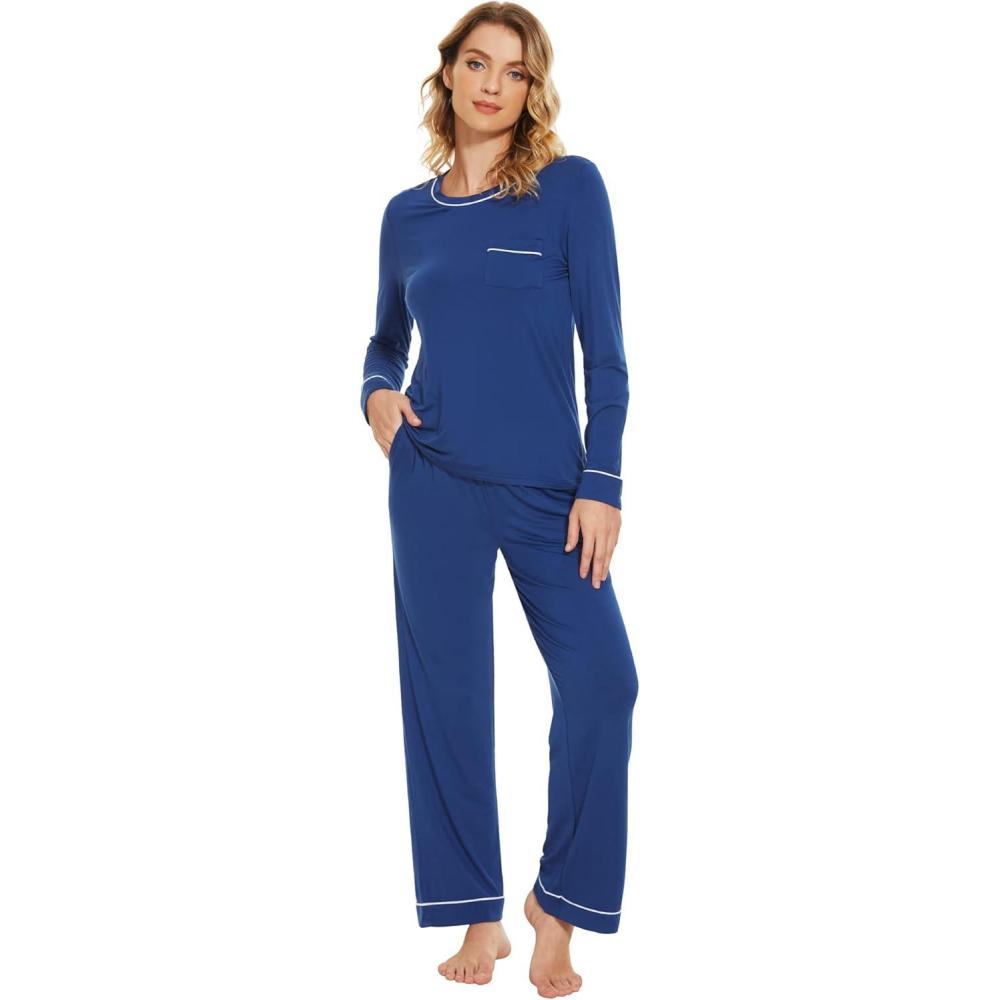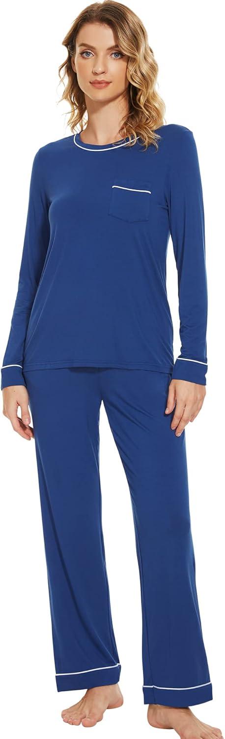 WiWi Women's Pajamas Set Soft Long Sleeve Tops and Pants Viscose from Bamboo Sleepwear Lightweight Pj Loungewear S-XXL(B-blue Depth)