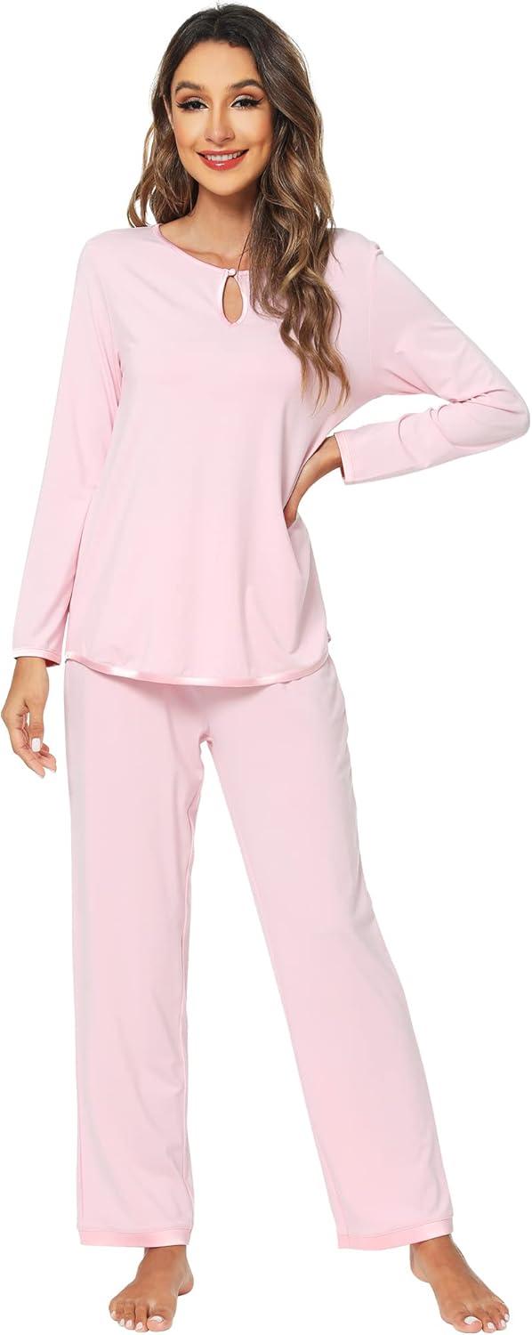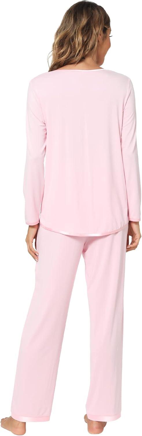 WiWi Women's Pajamas Set Soft Long Sleeve Tops and Pants Viscose from Bamboo Sleepwear Lightweight Pj Loungewear S-XXL(C-pink)