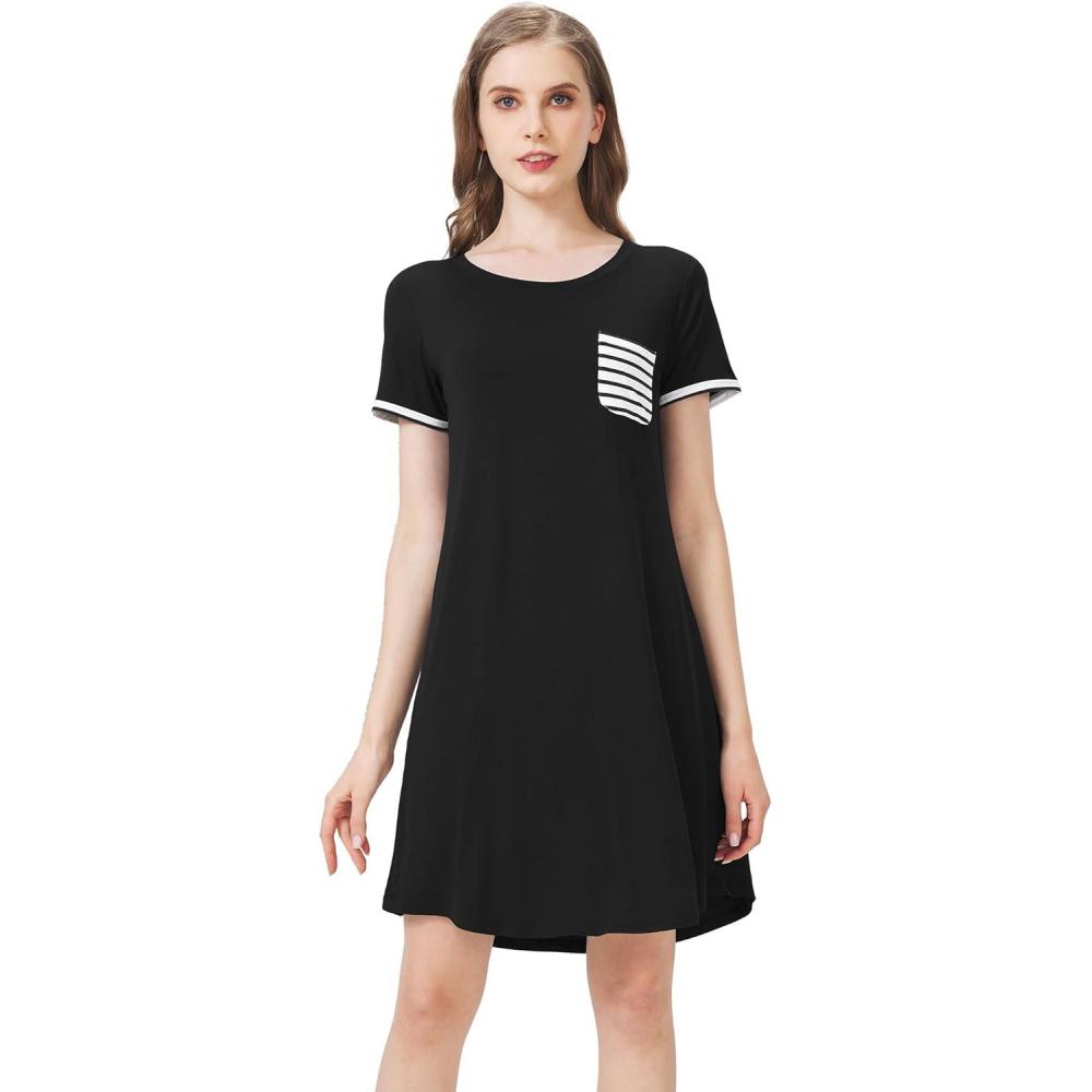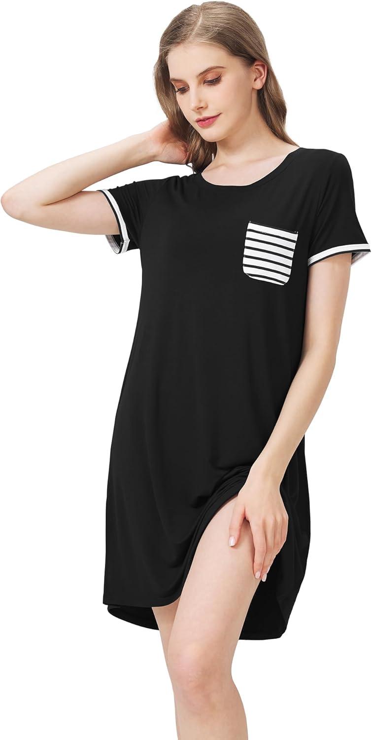 WiWi Women’s Viscose Bamboo Nightgowns Casual Short Sleeve Sleepwear Scoop Neck Nightshirts S-XXL(Black)