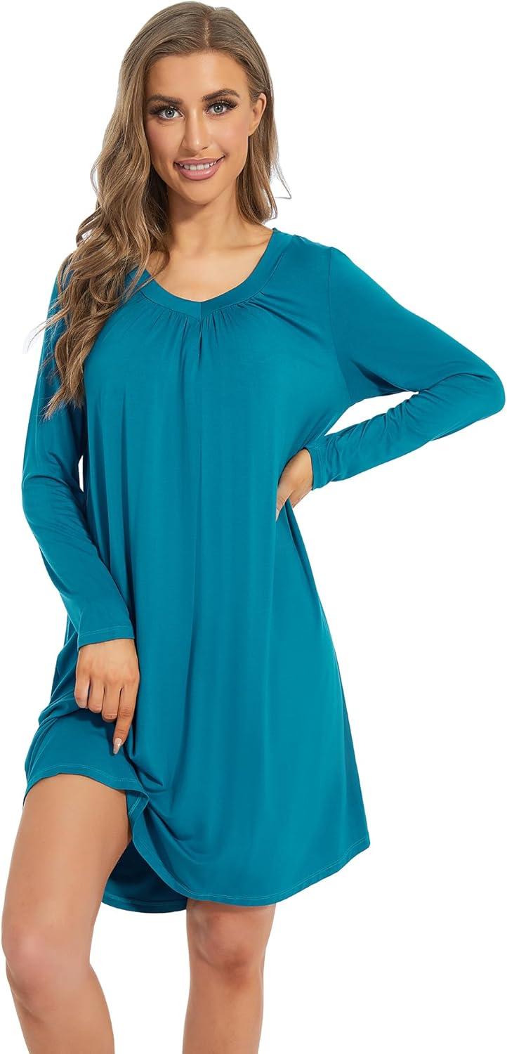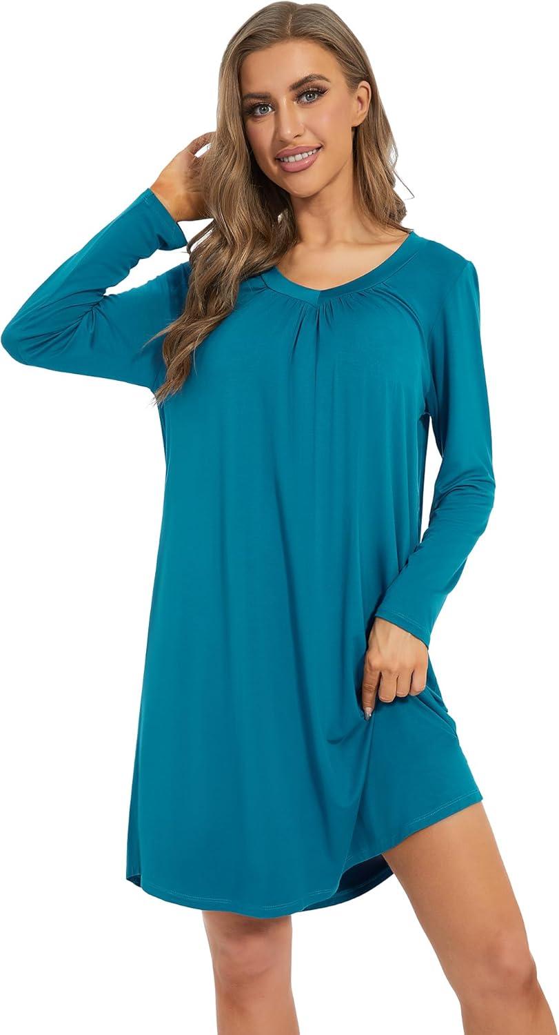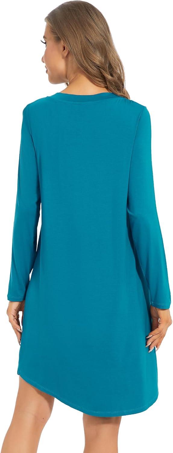WiWi Women's Viscose from Bamboo Nightgown Long Sleeve Nightshirt Soft Sleep Dress Loose Comfy Pajama Sleepwear S-XXL(C-dark Teal)
