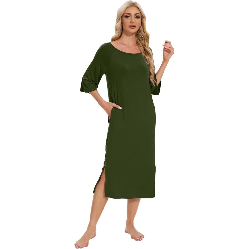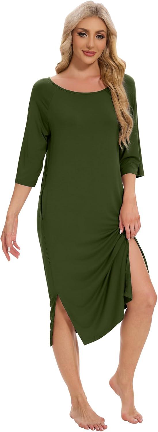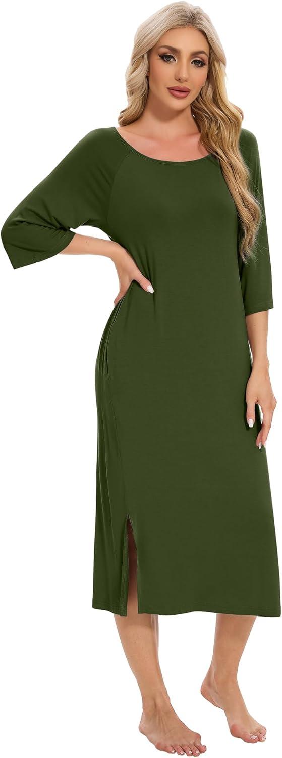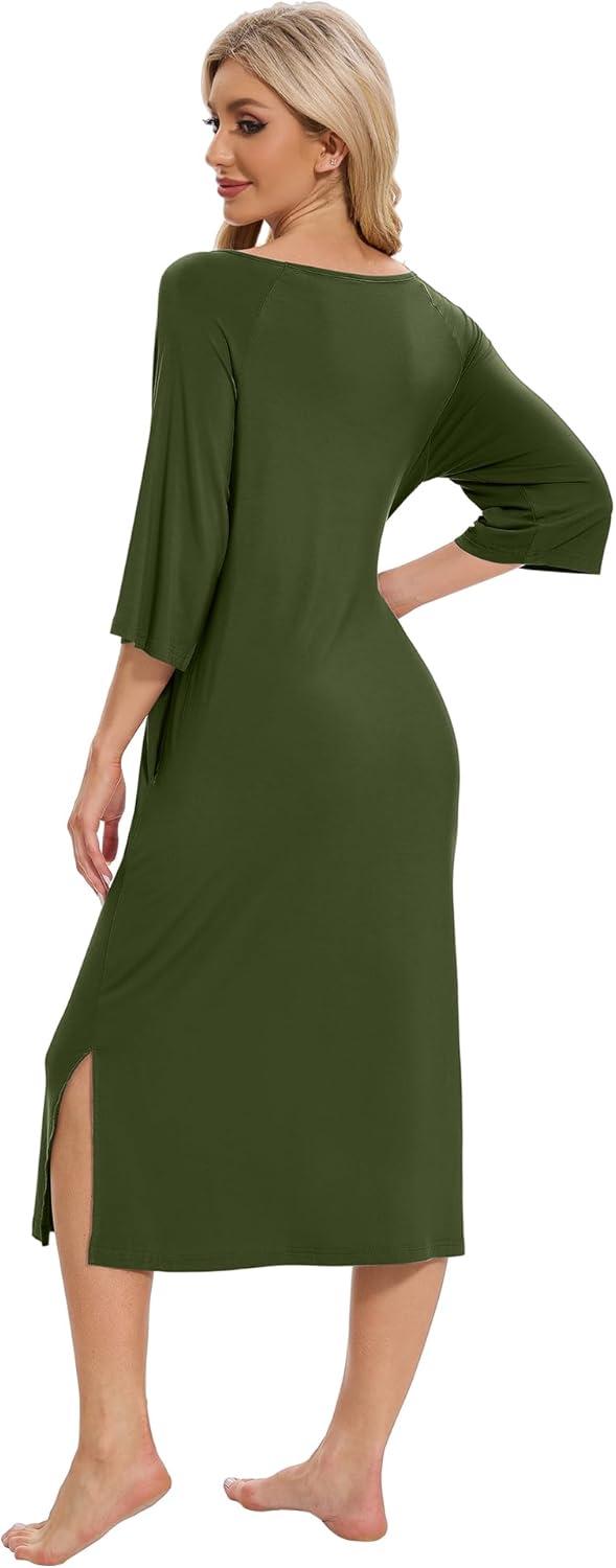 WiWi Womens Viscose from Bamboo Nightgowns 3/4 Sleeves Nightshirts Full Length Soft Knit Sleep Shirts S-XXL(A-army Green)