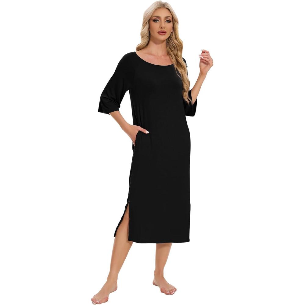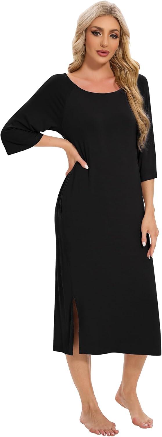 WiWi Womens Viscose from Bamboo Nightgowns 3/4 Sleeves Nightshirts Full Length Soft Knit Sleep Shirts S-XXL(A-black)