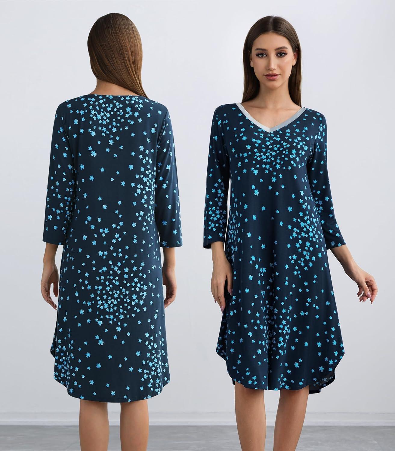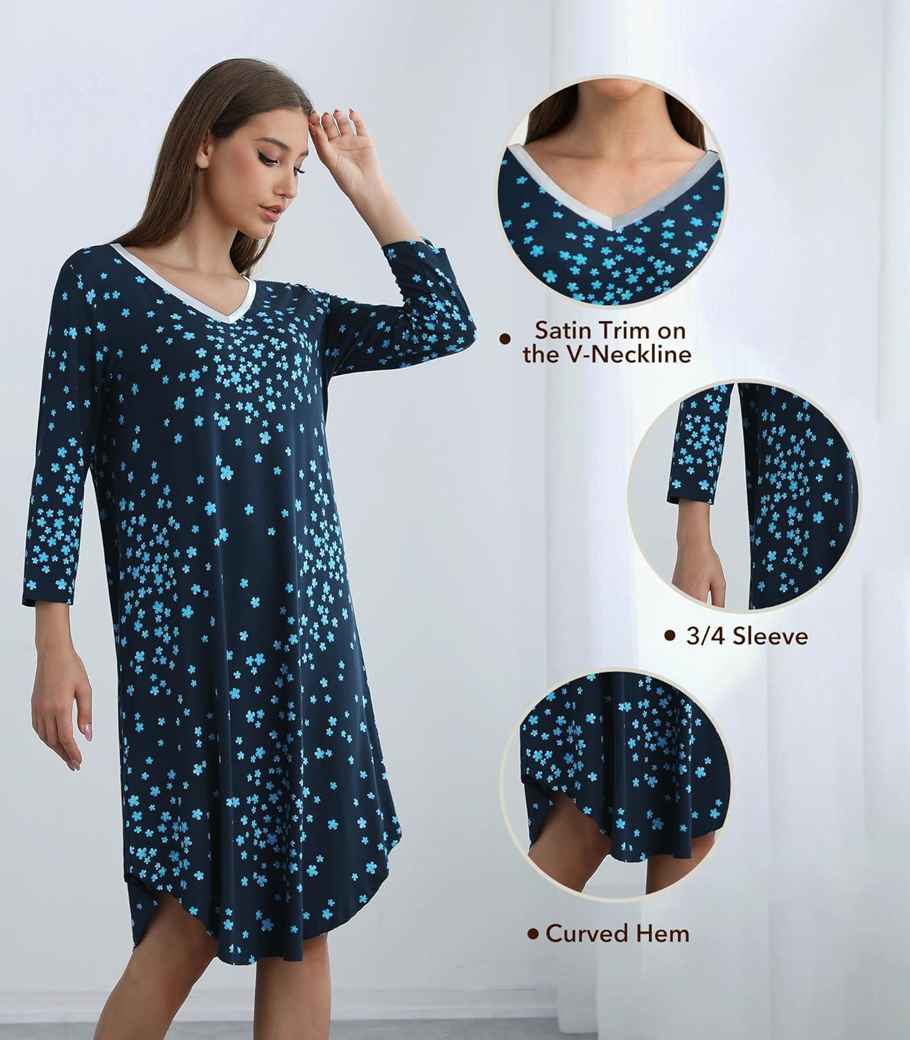 WiWi Womens Viscose from Bamboo Nightgowns 3/4 Sleeves Nightshirts Full Length Soft Knit Sleep Shirts S-XXL(B-blue Flowers)
